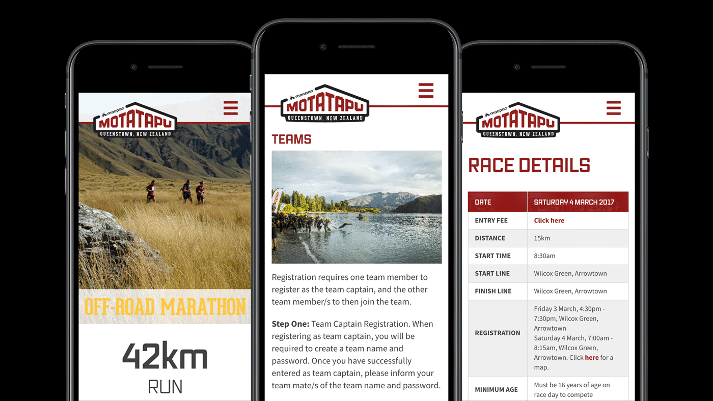 The Motatapu is an iconic NZ off-road sporting event, attracting thousands of local and international entrants every year, but their brand and website was looking tired, and confused after years of add-ons and new sub events. We created a new identity for Motatapu that retained key elements of the legacy brand while looking fresher and more succinct.